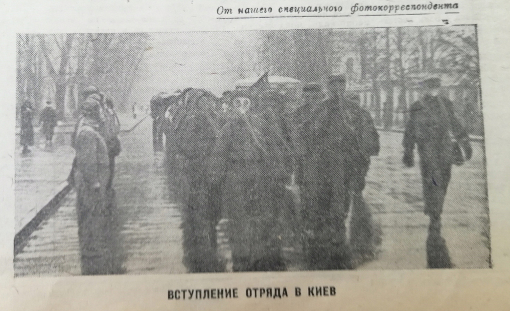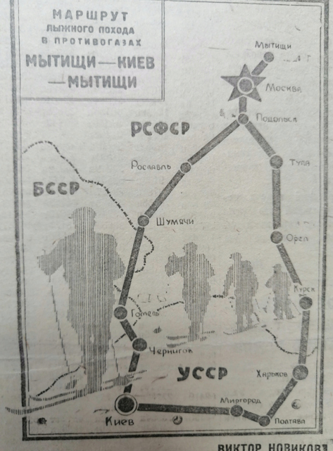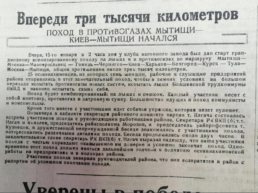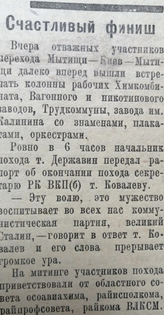 Вчера отважных участников перехода Мытищи-Киев-Мытищи далеко вперёд вышли встречать колонны рабочих Химкомбината, Вагонного и Никотинового заводов, Трудкоммуны, завода имени Калинина со знамёнами, плакатами, оркестрами.