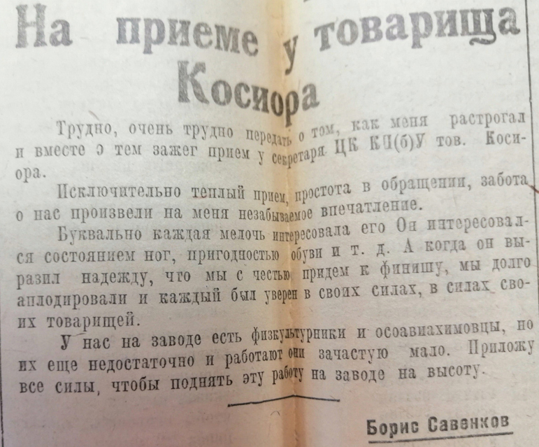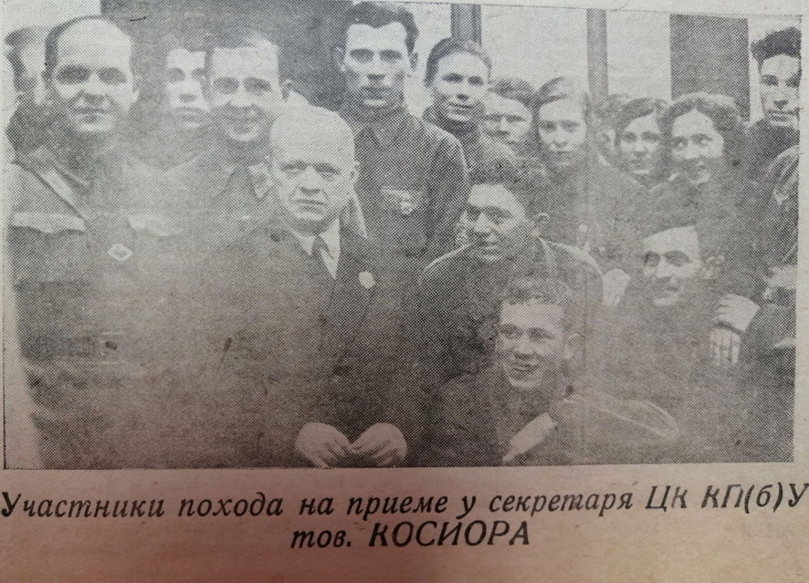 И, наконец, газета за 18 марта. Вторая и третья страницы газеты целиком посвящены информации о встрече наших героев, перечислены фамилии всех участников похода, напечатаны их воспоминания и впечатления. Здесь же – схема маршрута похода, фотографии, сделанные на приёме у секретаря ЦК КП(б)Украины Станислава Косиора.